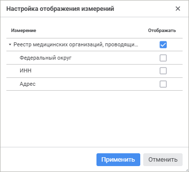 Отображение/скрытие измерений формирует структуру источника данных, от которой зависит вид активного визуализатора. Настройка структуры источника данных позволяет задать измерения, доступные для работы пользователю, и задать наименования атрибутов, отображаемых в визуализаторе.