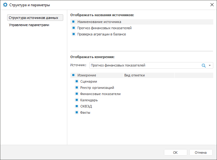 в настольном приложении используйте вкладку «Структура источника данных» в окне «Параметры». Вкладка «Структура источника данных» отличается от аналогичной вкладки в окне «Структура и параметры». Для получения подробной информации о настройке отображения измерений в окне «Параметры» обратитесь к разделу «Настройка структуры источника данных»;