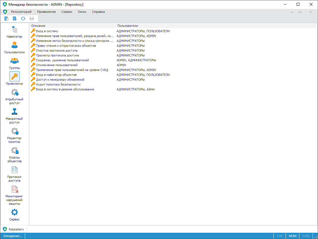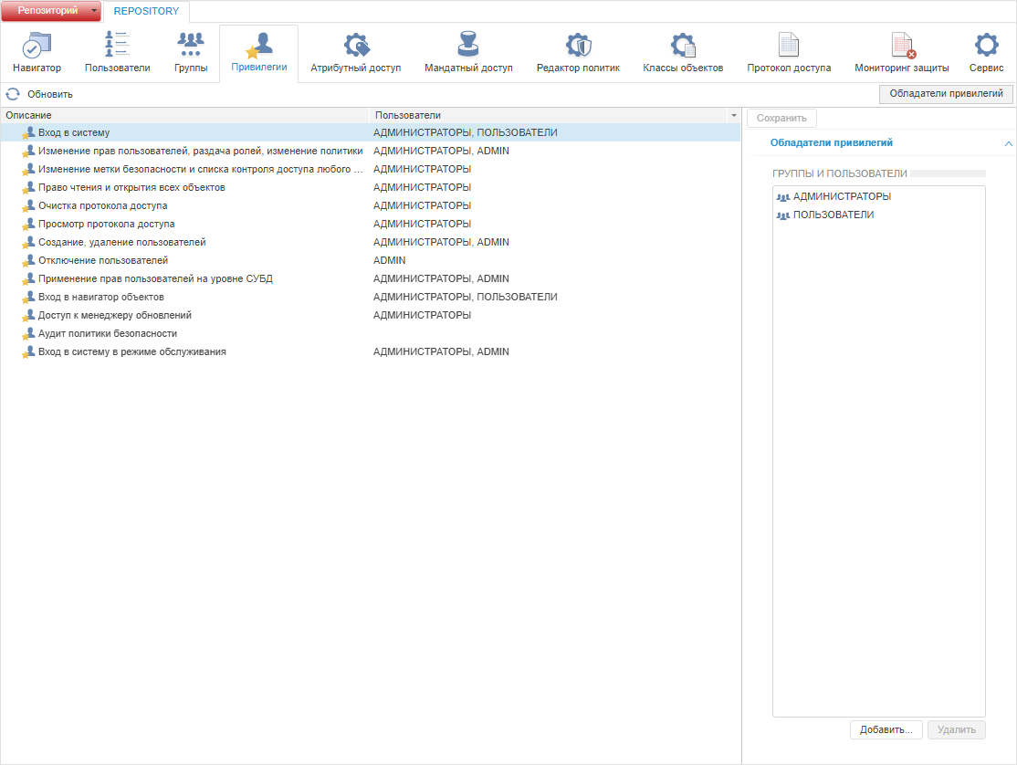 Примечание. При разделении ролей между администратором информационной безопасности и прикладным администратором раздел «Привилегии» будет доступен только администратору информационной безопасности.