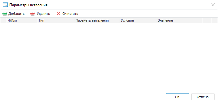 Примечание. Доступно только для типа условия «Параметр». Набор отображаемых типов условия зависит от параметра или типа данных его атрибута, выбранного в столбце «Параметр ветвления».