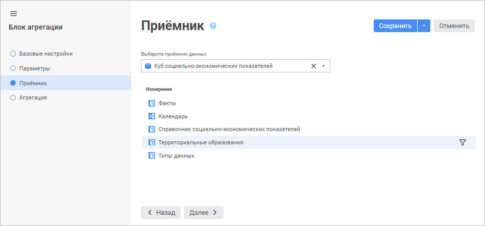 Приёмник определяет объект, в который будут агрегированы и выгружены данные после расчёта блока. В качестве приёмника могут использоваться следующие объекты репозитория: