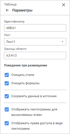 Для настройки общих параметров табличной области используйте группу параметров «Параметры» боковой панели: