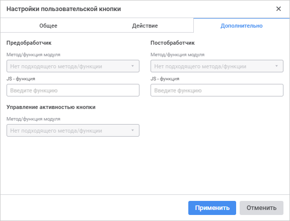 Модуль. При необходимости выберите из раскрывающегося списка модуль, написанный на языке Fore. Модуль может быть использован для предобработчика, постобработчика, управления активностью кнопки, настройка которых выполняется на вкладке «Дополнительно». Для кнопки можно задать только один модуль;