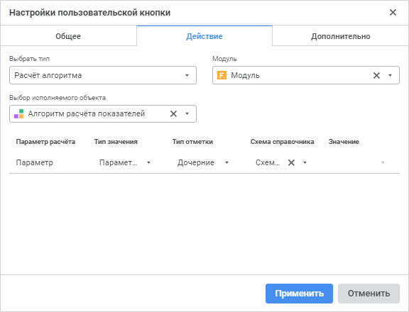 Пользовательские кнопки отображаются на панели инструментов и предназначены для ручного выполнения Fore-модулей или JavaScript-функций (JS-функций), открытия объектов репозитория и запуска алгоритмов расчёта.