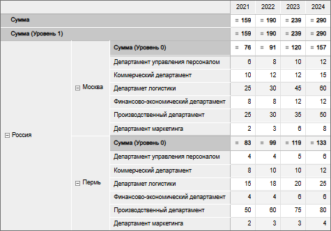Флажки «По иерархии», «По уровням» актуальны, если в таблице отображаются элементы иерархического измерения разных уровней иерархии.