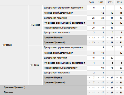 Примечание. Если боковик/шапка таблицы состоит из нескольких иерархических измерений, то при расчёте промежуточных итогов каждое следующее левое/верхнее измерение берёт итог высшего уровня правого/нижнего измерения.