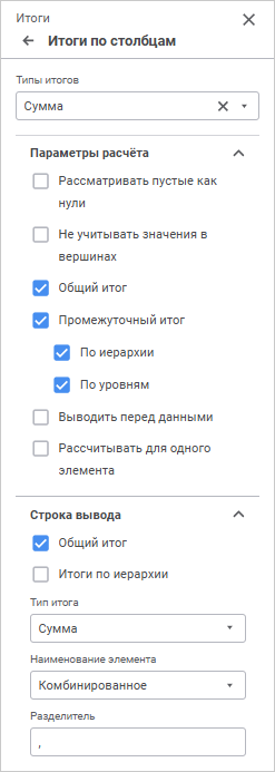 Разделитель. В поле задаётся разделитель между наименованиями элемента и метода итога. По умолчанию в качестве разделителя установлена запятая «,». Параметр доступен, если установлен флажок «Общий итог» и/или «Итоги по иерархии» и выбран тип наименования «Комбинированное».