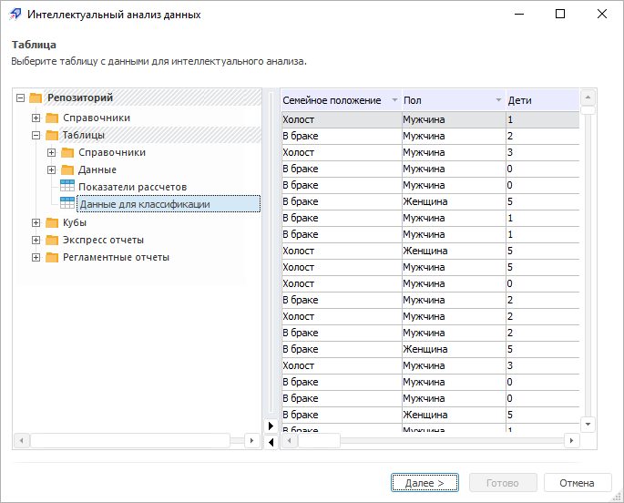 из объекта репозитория «Таблица». Интеллектуальный анализ данных выполняется над данными, размещенными в таблице;