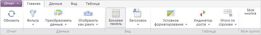 После выполнения примера на ленту инструментов экспресс-отчета будет добавлена новая группа кнопок «Моя группа» с одноимённой кнопкой: