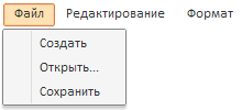 Компонент включает в себя три кнопки. При нажатии на кнопку «Файл» раскрывается меню, состоящее из трех элементов. При выборе любого из этих элементов на экран будет выводиться сообщение «Выбран пункт <название пункта>».