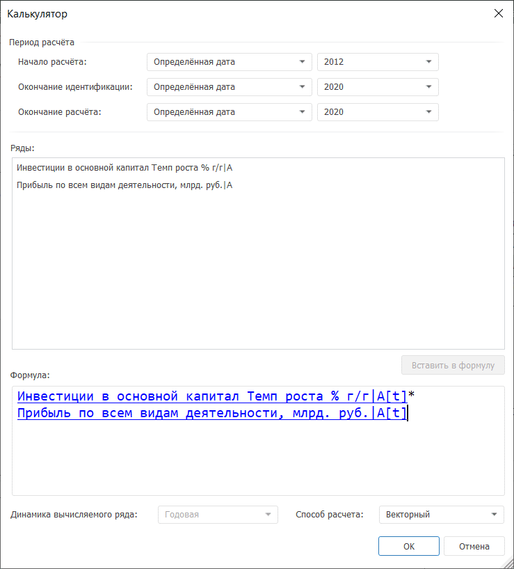 Для настройки параметров расчёта используйте вкладку «Параметры» на панели свойств. На вкладке содержится формула, по которой рассчитан вычисляемый ряд.