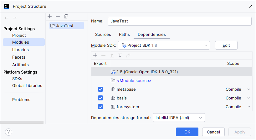 Java-проекта, перейдите в группу настроек «Modules», вкладка «Dependencies»,