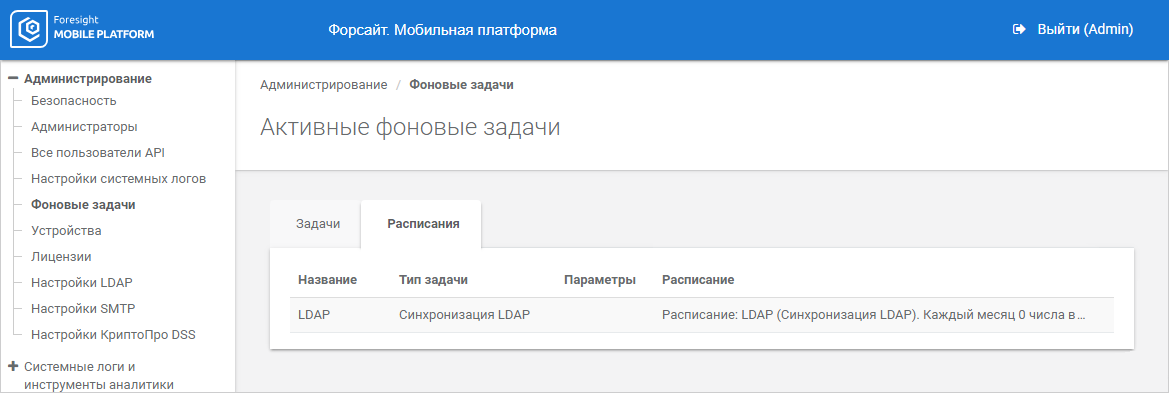 На вкладке «Задачи» отображается журнал с активными фоновыми задачами, которые выполняются в текущий момент по расписанию или происходят параллельно с платформой.