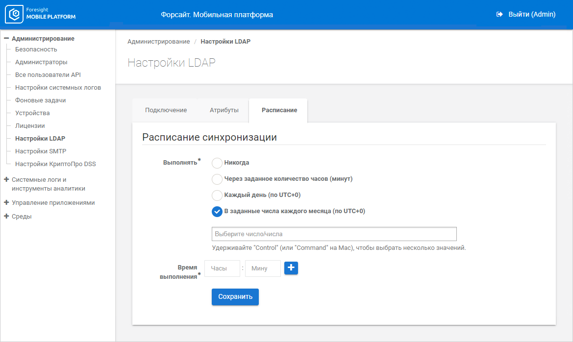 После выполнения действий будет задано расписание синхронизации для обмена информации о существующих пользователях между LDAP и платформой. Обмен носит односторонний характер, в котором LDAP является источником.