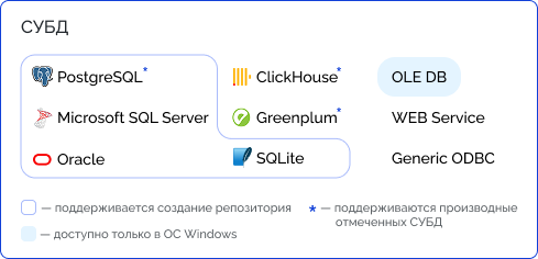 | ClickHouse | Поддерживается подключение посредством драйверов ODBC, установленных в OC Windows или OC Linux. В веб-приложении доступно подключение к базе данных СУБД ClickHouse напрямую. Примечание. Не используется для подключения к репозиторию. |