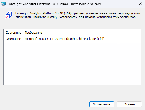 После нажатия кнопки «Установить» будет произведена попытка последовательной установки всех предлагаемых компонентов. Если необходимые пререквизиты отсутствуют в папке «ISSetupPrerequisites», то установка «Форсайт. Аналитическая платформа» будет остановлена и будет выдано соответствующее сообщение.