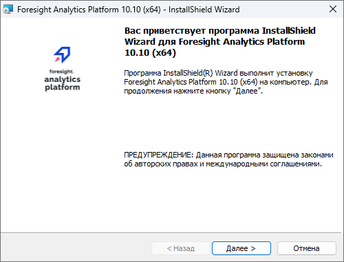 Запустите один из инсталляторов, входящих в комплект поставки продукта «Форсайт. Аналитическая платформа»: