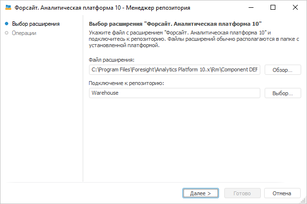 Первичная установка расширений выполняется с помощью менеджера репозитория, который входит в состав продукта «Форсайт. Аналитическая платформа».