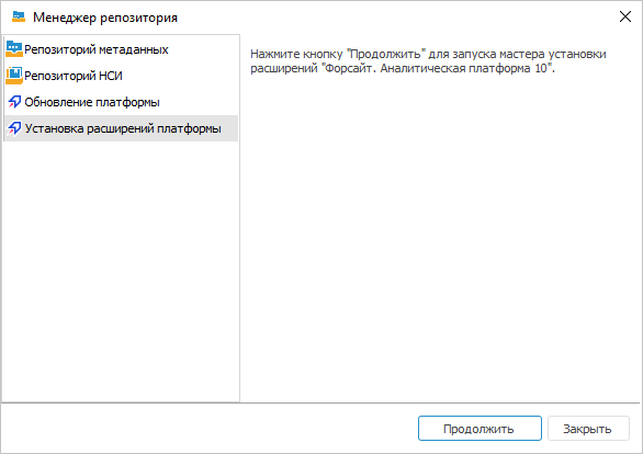 Запустите менеджер репозитория. Для этого используйте ярлык, который создаётся в главном меню Windows, или приложение RepoMngr.exe, расположенное в папке установки продукта «Форсайт. Аналитическая платформа». После запуска выберите пункт «Установка расширений платформы»: