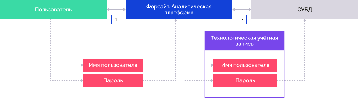 1. «Форсайт. Аналитическая платформа» обращается к СУБД, используя предварительно сохранённую технологическую учётную запись.