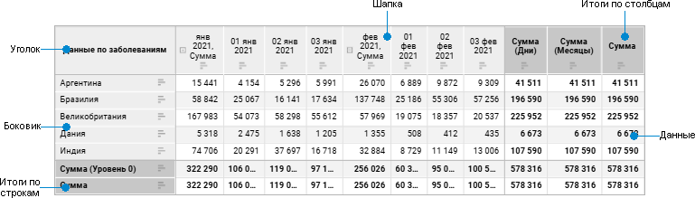 Примечание. Элементы таблицы «Итоги по строкам» и «Итоги по столбцам» отображаются, если для таблицы включено отображение итогов по строкам/столбцам.