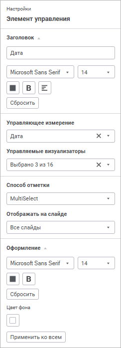 Заголовок. По умолчанию отображается наименование управляющего измерения. Для смены заголовка элемента управления введите новый текст заголовка и задайте параметры текста, аналогичные параметрам текста заголовка панели фильтров. Для сброса заданных настроек и возврата к стилю по умолчанию нажмите кнопку «Сбросить»;