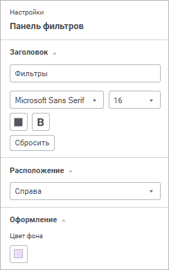 Заголовок. По умолчанию отображается наименование «Фильтры». Для смены заголовка панели фильтров введите новый текст заголовка и задайте параметры текста: