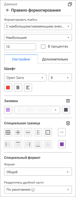 Для настройки форматирования ячеек с наибольшим/наименьшим значением используйте группу параметров «Условное форматирование» на боковой панели.