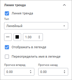 Для переопределения названия линии тренда в легенде установите флажок «Переопределить имя в легенде» и задайте новое название линии. Доступно только при установленном флажке «Отображать в легенде».