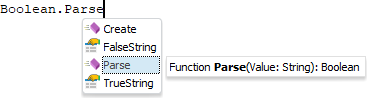 Для любого члена типа реализована всплывающая подсказка, содержащая синтаксис члена и список всех его обязательных и необязательных параметров. Данная подсказка выводится автоматически после указания открывающей круглой скобки после наименования члена типа. Параметр, значение которого редактируется в текущий момент, подсвечивается жирным шрифтом. После указания закрывающей круглой скобки всплывающая подсказка будет скрыта. Для вызова подсказки вручную используется сочетание клавиш CTRL+SHIFT+ПРОБЕЛ.