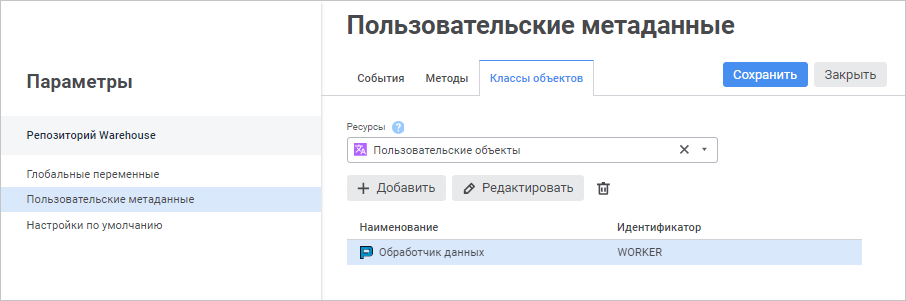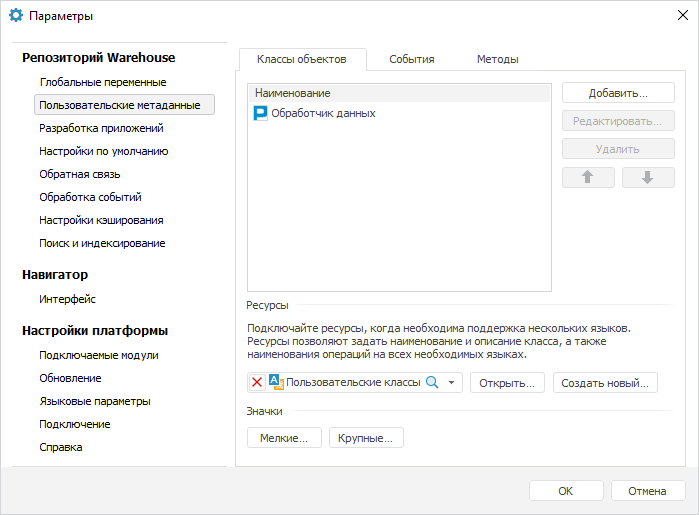 Работа с пользовательскими классами осуществляется на вкладке «Пользовательские метаданные > Классы объектов» в окне «Параметры».