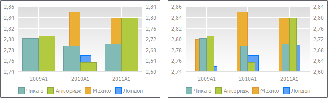 Пример гистограммы с боковым зазором для рядов дополнительной оси 50 (слева) и 350 (справа). Ряды «Мехико» и «Лондон» основные ряды, а «Чикаго» и «Анкоридж» ряды дополнительной оси:
