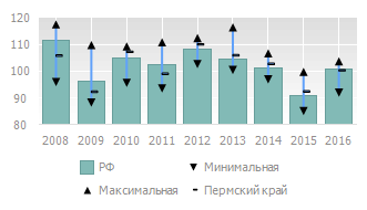 Для примера отображения гистограммы с интервалами колебаний, используем исходные данные «Реальная среднемесячная заработная плата работников, в % к предыдущему году»: