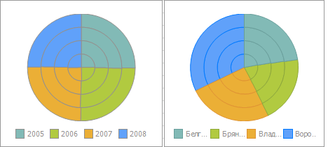отображение рядов в кольцах. Ниже приведены примеры круговой диаграммы, для которой настроено отображение рядов в кольцах (слева) и секторно (справа):
