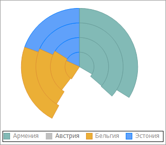 Каждая группа данных отображается в виде круга, разделённого на секторы, угловые размеры которых пропорциональны значениям элементов данных.