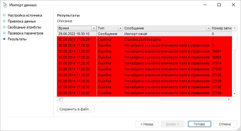 Закончите просмотр результатов импорта данных и нажмите кнопку «Готово» для закрытия объекта «Импорт данных».