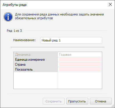 Если при сохранении нового временного ряда не заданы значения всех обязательных атрибутов, то будет отображен диалог «Атрибуты ряда»: