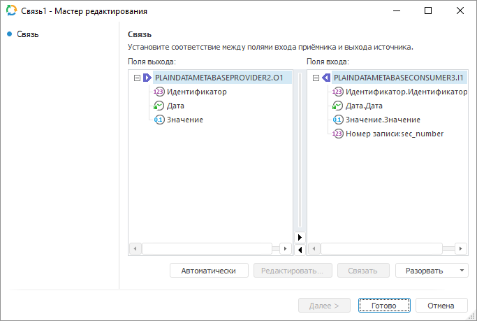 Автоматически создание связей. Для связи полей, имеющих одинаковые идентификаторы, нажмите кнопку «Автоматически»;