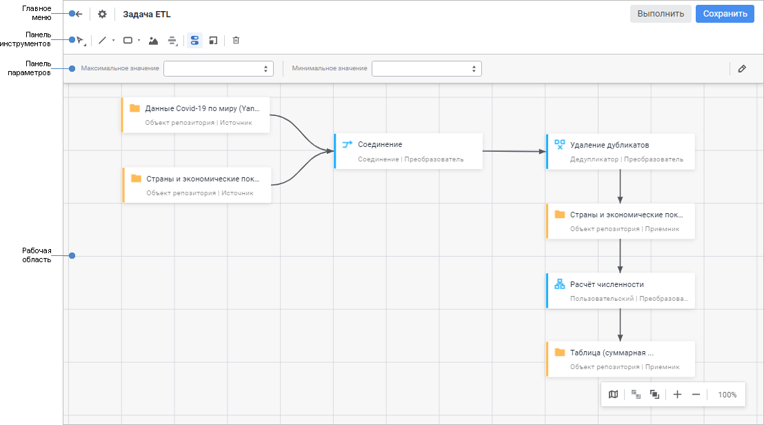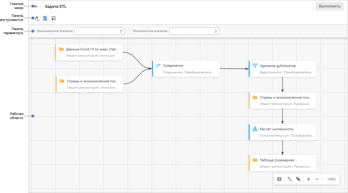 Для начала работы с инструментом создайте новую или откройте готовую задачу ETL.