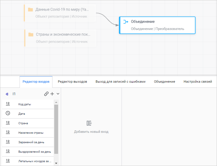 Примечание. Вкладка «Редактор входов» показана на примере преобразователя «Объединение». Вид панели и количество доступных входов зависит от типа преобразователя.