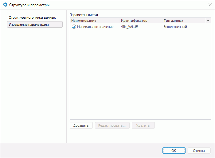Для создания и редактировании параметров листа экспресс-отчёта используйте вкладку «Управление параметрами» в диалоге «Структура и параметры».