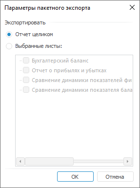 Выполните команду главного меню «Отчет > Экспорт > Пакетный экспорт». Будет открыт диалог «Параметры пакетного экспорта»:
