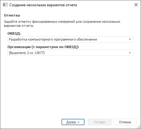 В раскрывающихся списках выберите элементы фиксированных измерений, по которым нужно создать варианты отчёта. Количество отчётов, которые будут экспортированы, равно декартовому произведению отмеченных элементов в фиксированных измерениях. Например, на рисунке выше видим, что в первом измерении отмечено 2 элемента, а во втором - 1 элемент. Количество возможных пар, которые можно составить из этих элементов (т.е. декартово произведение) - 2, соответственно, будет создано 2 варианта отчёта.