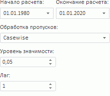 Лаг. Задайте лаг для значений переменной. Рекомендуется проводить тест для нескольких различных значений лага и выяснить, насколько сильно размер лага влияет на результаты теста.