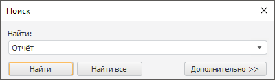 В поле «Найти» введите наименование объекта, который необходимо найти. После нажатия кнопки «Найти» фокус будет перемещён к первому найденному объекту, удовлетворяющему параметрам поиска. Название кнопки изменится на «Найти далее», нажатие которой приводит к поэтапному получению результатов поиска.