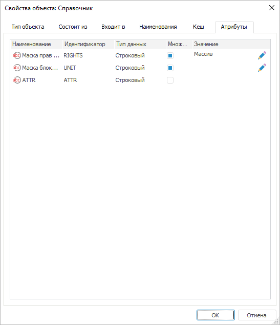 На вкладке «Атрибуты» содержатся атрибуты объекта, добавленные для классов объектов и типов объектов.