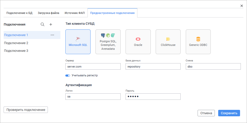 Для подключения к базе данных с ранее заданными настройками выберите шаблон подключения в раскрывающемся списке «Преднастроенные подключения». Все настройки подключения будут автоматически заполнены в соответствии с шаблоном. Для редактирования настроек подключения перейдите на вкладку «Преднастроенные подключения» окна добавления источника.