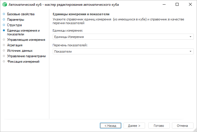 На странице «Единицы измерения и показатели» в случае необходимости указывается справочник единиц измерения и справочник в качестве перечня показателей. Указание данных справочников позволяет реализовать автоматический пересчёт единиц измерения: