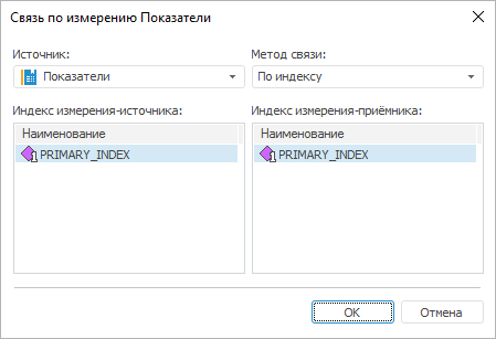 Связи измерений. В поле формируется связь измерений куба-источника с кубом-приёмником. Если в кубе -источнике и кубе-приёмнике имеются одинаковые измерения, то между ними автоматически устанавливается связь по индексу;