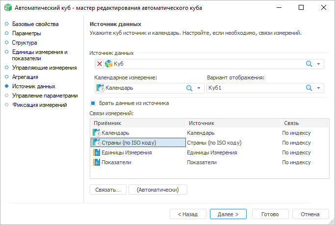 Источник данных. Позволяет выбрать источник данных для автокуба, возможны следующие варианты: